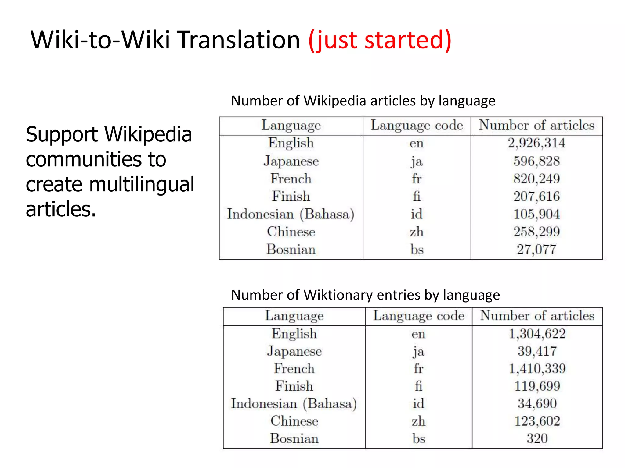 42. 42. Wiki-to-Wiki Translation (just started)<br />Number of Wikipedia articles by language<br />Support Wikipedia communities to create multilingual articles.<br />Number of Wiktionary entries by language<br />15<br />