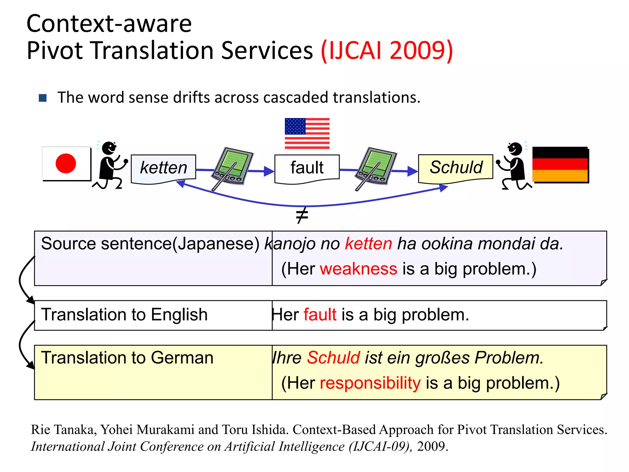 44. 44. Context-aware Pivot Translation Services (IJCAI 2009)<br /><ul><li>The word sense drifts across cascaded translations.</li></ul>Schuld<br />ketten<br />fault<br />≠<br />Source sentence(Japanese)kanojono ketten ha ookinamondaida.<br /> (Her weakness is a big problem.)<br />Translation to English Her fault is a big problem.<br />Translation to German IhreSchuldisteingroßes Problem.<br /> (Her responsibility is a big problem.)<br />Rie Tanaka, Yohei Murakami and Toru Ishida. Context-Based Approach for Pivot Translation Services. International Joint Conference on Artificial Intelligence (IJCAI-09), 2009.<br />