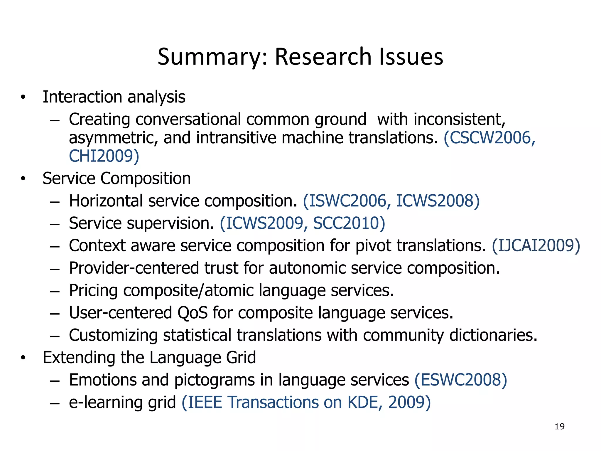46. 46. Summary: Research Issues<br />Interaction analysis<br />Creating conversational common ground with inconsistent, asymmetric, and intransitive machine translations. (CSCW2006, CHI2009)<br />Service Composition<br />Horizontal service composition. (ISWC2006, ICWS2008)<br />Service supervision. (ICWS2009, SCC2010)<br />Context aware service composition for pivot translations. (IJCAI2009)<br />Provider-centered trust for autonomic service composition. <br />Pricing composite/atomic language services.<br />User-centered QoS for composite language services.<br />Customizing statistical translations with community dictionaries.<br />Extending the Language Grid<br />Emotions and pictograms in language services (ESWC2008)<br />e-learning grid (IEEE Transactions on KDE, 2009)<br />19<br />