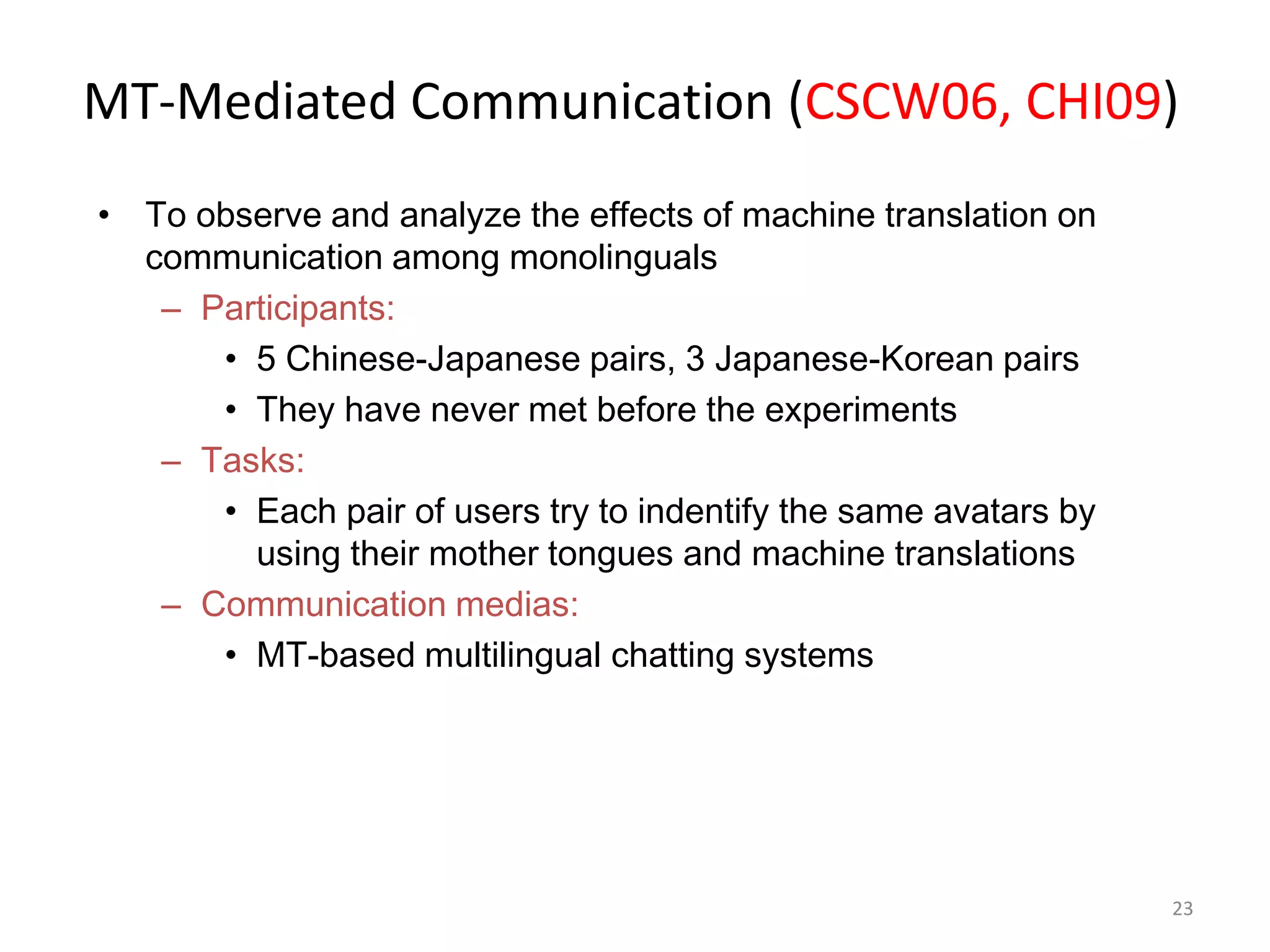 50. 50. 23<br />MT-Mediated Communication (CSCW06, CHI09)<br />To observe and analyze the effects of machine translation on communication among monolinguals<br />Participants:<br />5 Chinese-Japanesepairs, 3 Japanese-Korean pairs<br />They have never met before the experiments<br />Tasks:<br />Each pair of users try to indentify the same avatars by using their mother tongues and machine translations<br />Communication medias:<br />MT-based multilingual chatting systems<br />