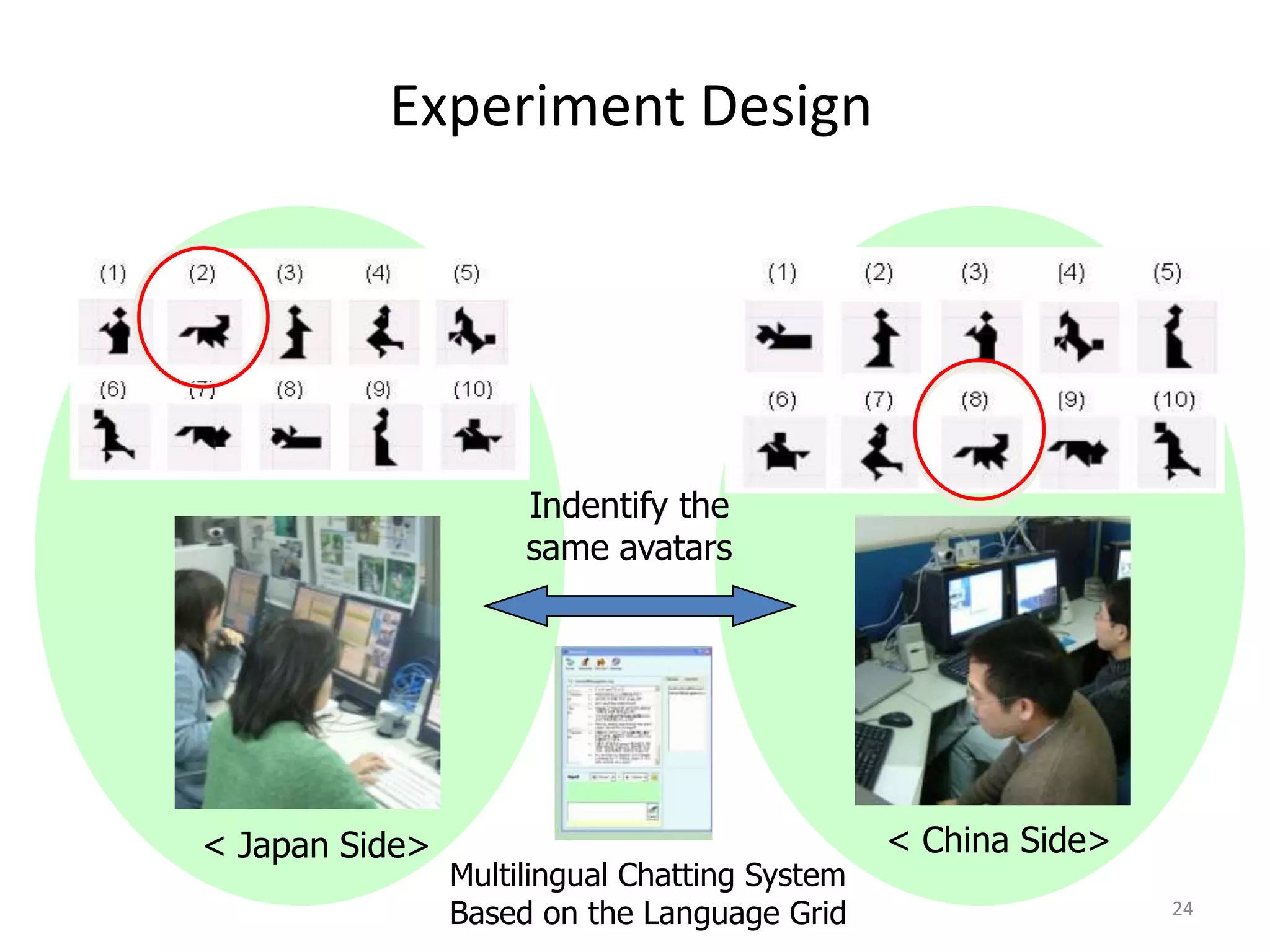 51. 51. 24<br />Experiment Design<br />Indentify the same avatars<br />< China Side><br />< Japan Side><br />Multilingual Chatting System<br />Based on the Language Grid<br />