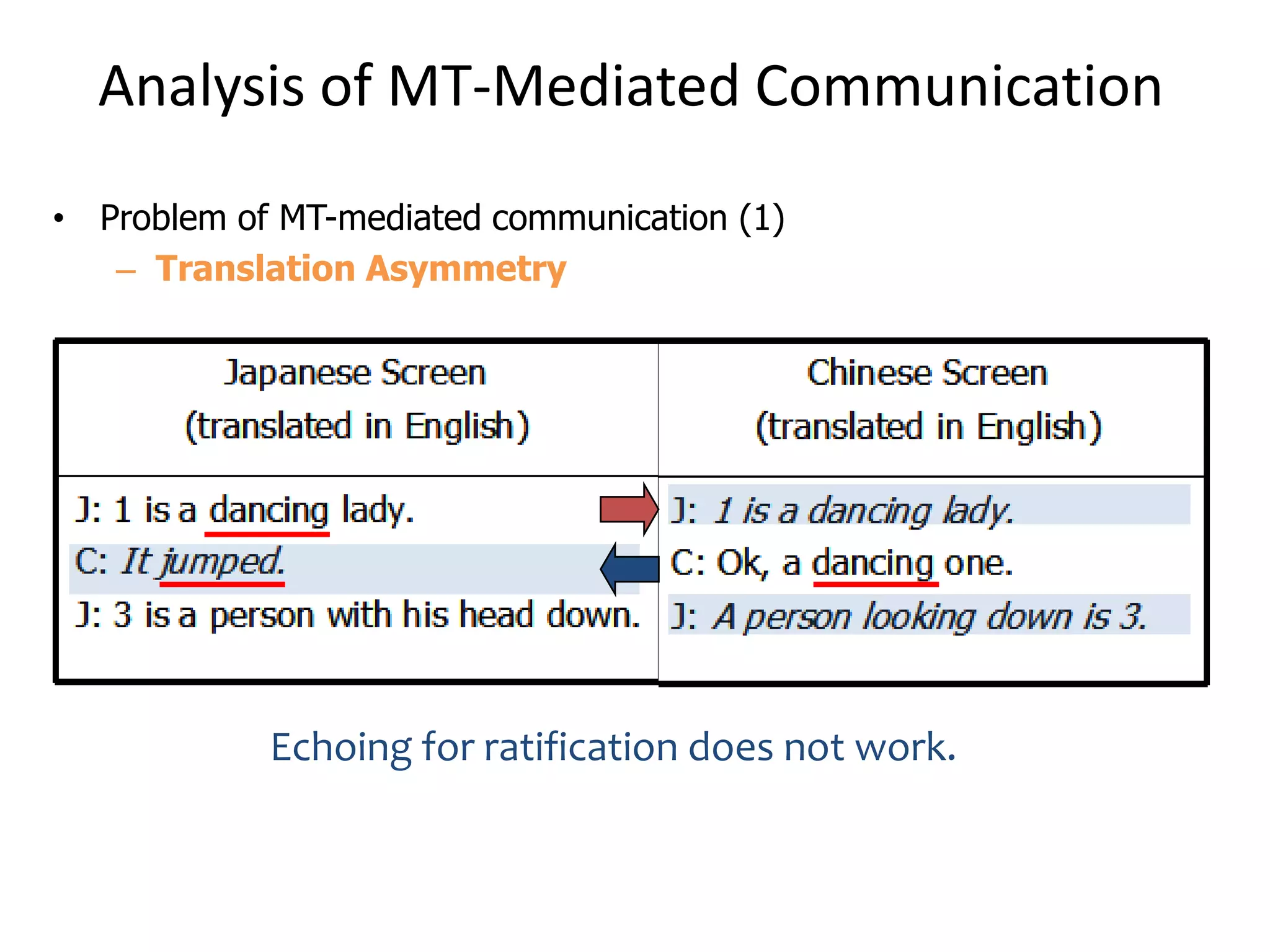 52. 52. Analysis of MT-Mediated Communication<br />Problem of MT-mediated communication (1)<br />Translation Asymmetry<br />Echoing for ratification does not work.<br />