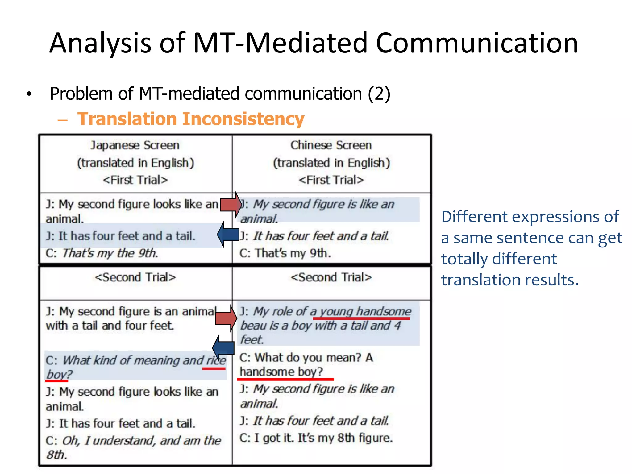 53. 53. Analysis of MT-Mediated Communication<br />Problem of MT-mediated communication (2)<br />Translation Inconsistency<br />Different expressions of a same sentence can get totally different translation results.<br />