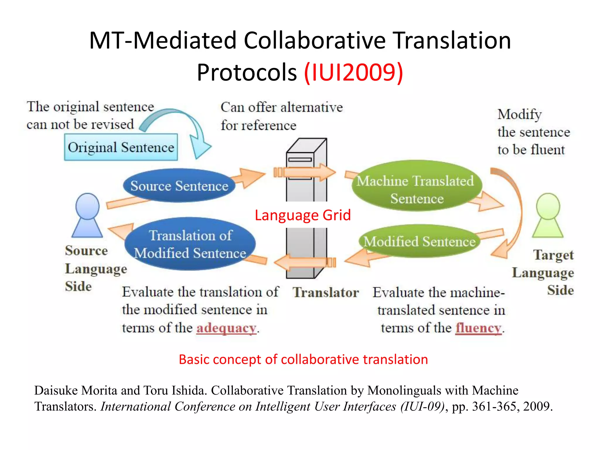 54. 54. MT-Mediated Collaborative Translation Protocols (IUI2009)<br />Language Grid<br />Basic concept of collaborative translation<br />DaisukeMorita and Toru Ishida. Collaborative Translation by Monolinguals with Machine Translators. International Conference on Intelligent User Interfaces (IUI-09), pp. 361-365, 2009.<br />