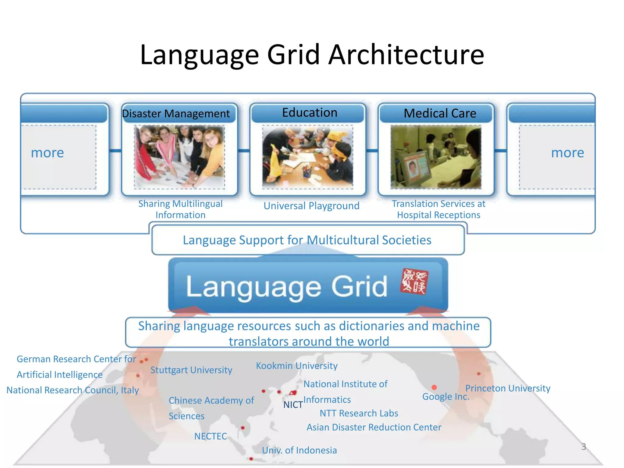 3. 3. Language Grid Architecture<br />Education<br />Medical Care<br />Disaster Management<br />more<br />more<br />Sharing Multilingual Information<br />Translation Services at Hospital Receptions<br />Universal Playground<br />Language Support for Multicultural Societies<br />Sharing language resources such as dictionaries and machine translators around the world<br />German Research Center for Artificial Intelligence<br />Kookmin University<br />Stuttgart University<br />National Institute of Informatics<br />Princeton University<br />National Research Council, Italy<br />Chinese Academy of Sciences<br />Google Inc.<br />NICT<br />NTT Research Labs<br />Asian Disaster Reduction Center<br />NECTEC<br />Univ. of Indonesia<br />3<br />