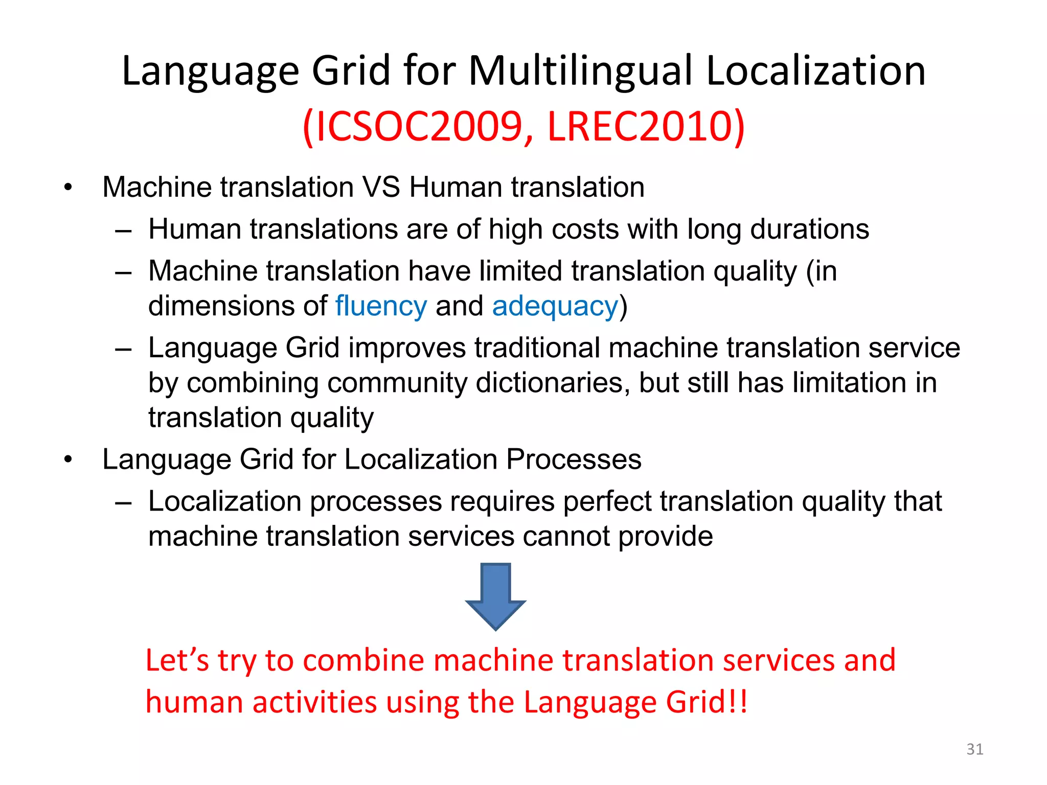 58. 58. Language Grid for Multilingual Localization (ICSOC2009, LREC2010)<br />Machine translation VS Human translation <br />Human translations are of high costs with long durations<br />Machine translation have limited translation quality (in dimensions of fluency and adequacy)<br />Language Grid improves traditional machine translation service by combining community dictionaries, but still has limitation in translation quality<br />Language Grid for Localization Processes<br />Localization processes requires perfect translation quality that machine translation services cannot provide<br />31<br />Let’s try to combine machine translation services and human activities using the Language Grid!!<br />