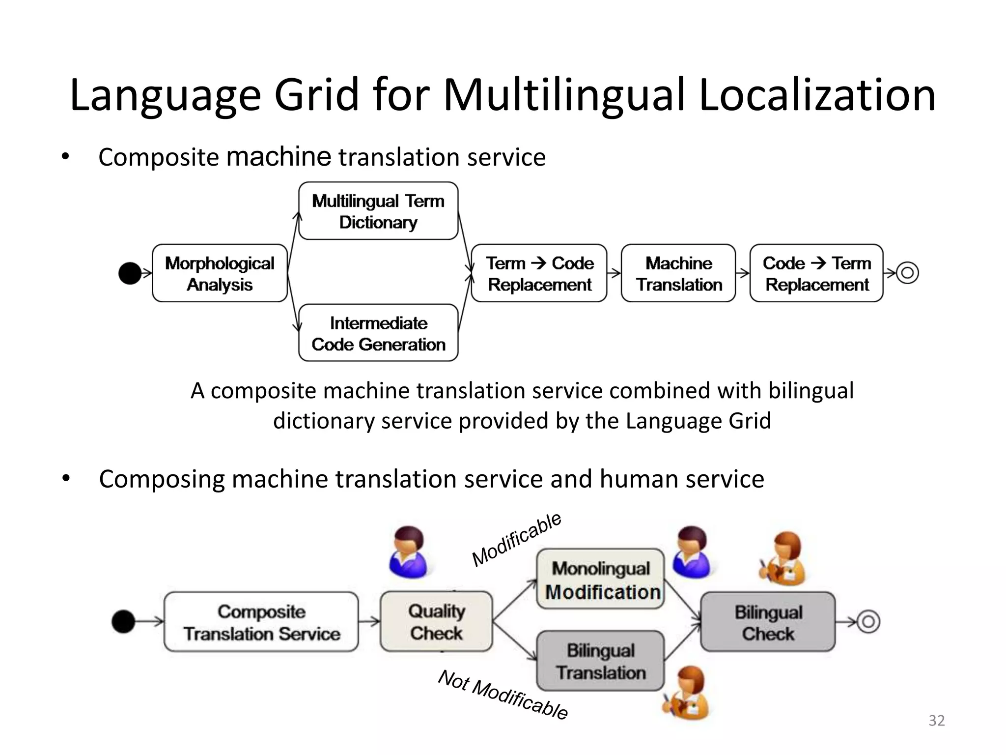 59. 59. Language Grid for Multilingual Localization<br />Composite machine translation service<br />32<br />A composite machine translation service combined with bilingual dictionary service provided by the Language Grid<br /><ul><li>Composing machine translation service and human service</li></ul>Modificable<br />Not Modificable<br />