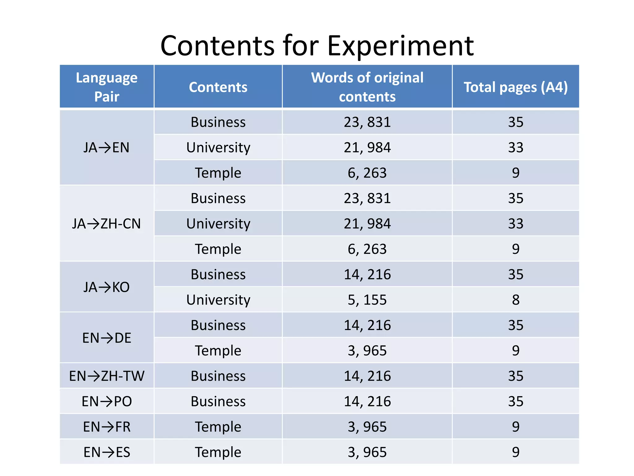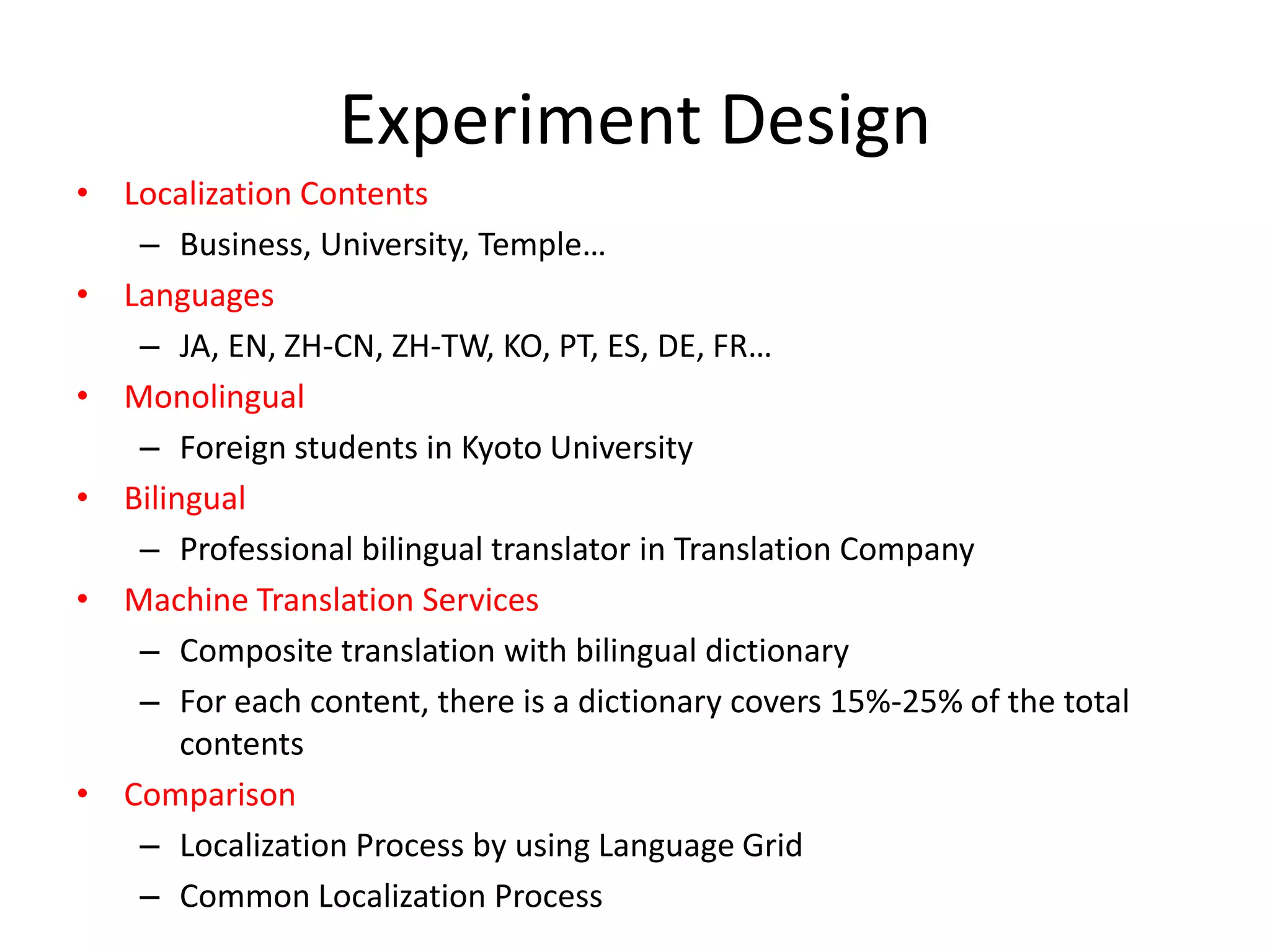 60. 60. Experiment Design<br />Localization Contents<br />Business, University, Temple…<br />Languages<br />JA, EN, ZH-CN, ZH-TW, KO, PT, ES, DE, FR…<br />Monolingual<br />Foreign students in Kyoto University <br />Bilingual<br />Professional bilingual translator in Translation Company<br />Machine Translation Services<br />Composite translation with bilingual dictionary<br />For each content, there is a dictionary covers 15%-25% of the total contents<br />Comparison<br />Localization Process by using Language Grid<br />Common Localization Process <br />