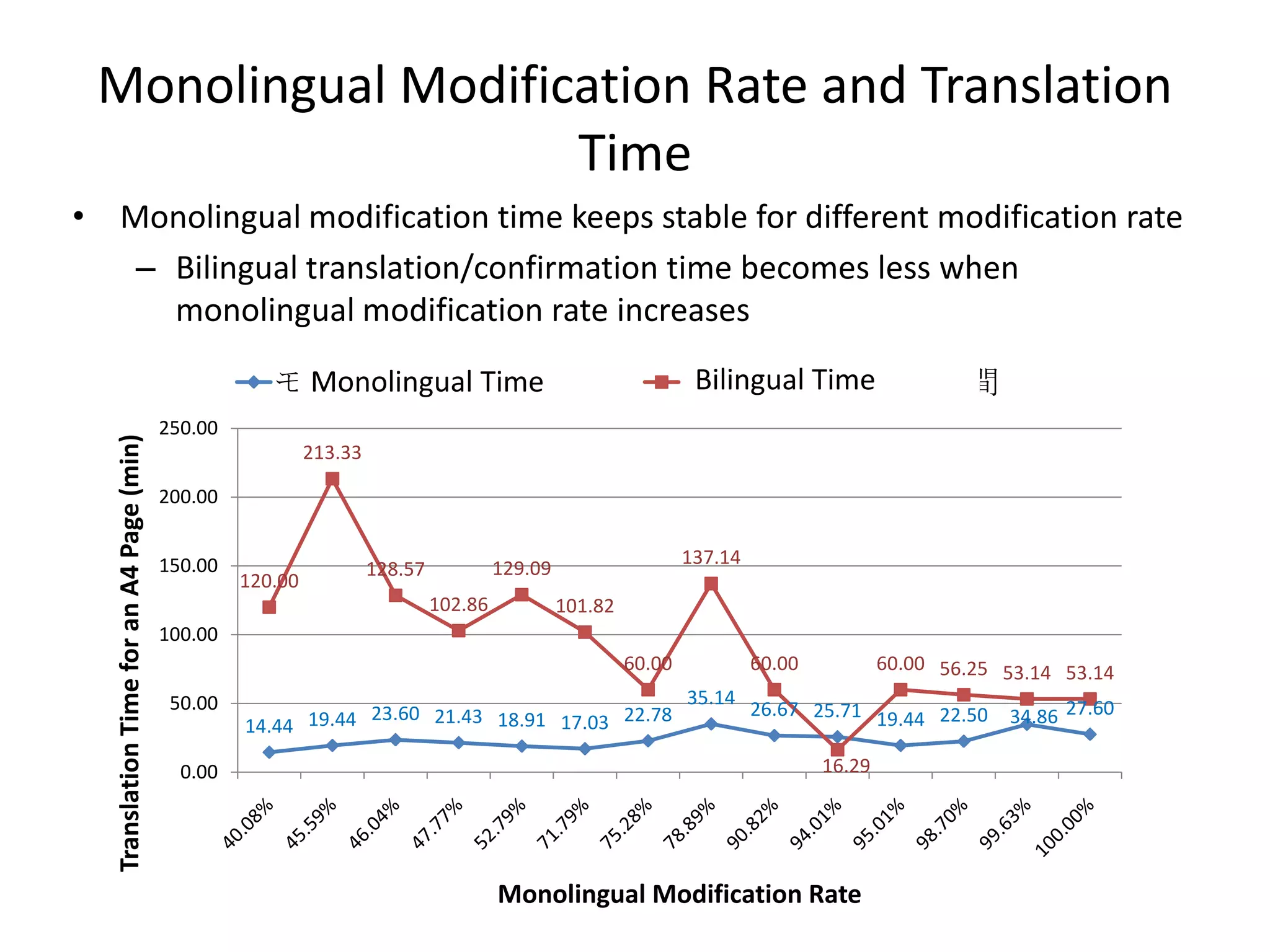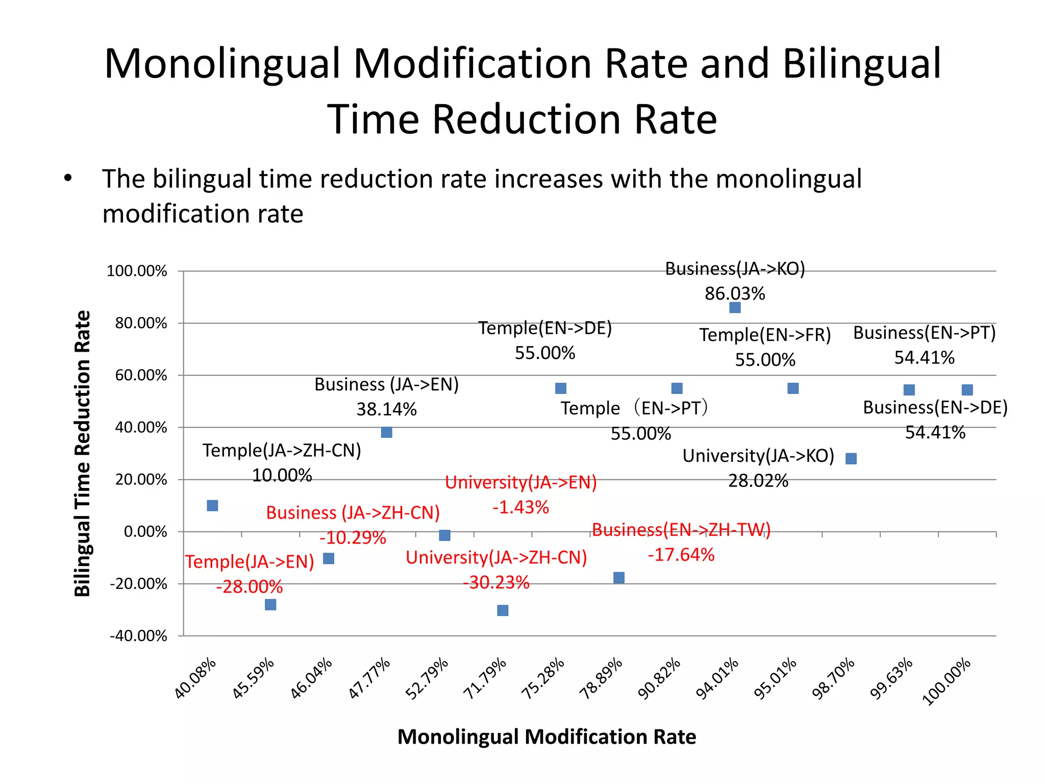 65. 65. Monolingual Modification Rate and Bilingual Time Reduction Rate<br />The bilingual time reduction rate increases with the monolingual modification rate<br />