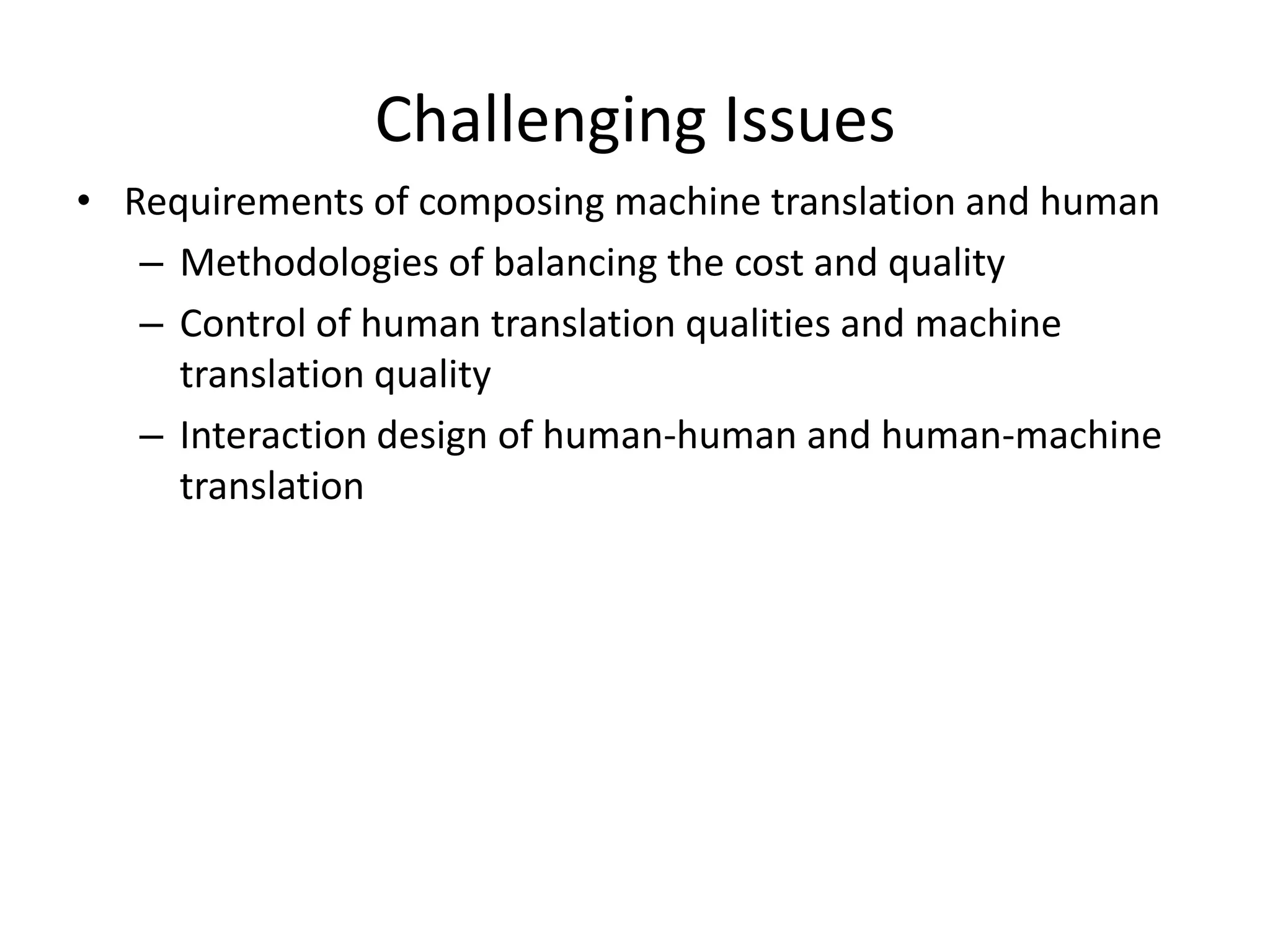 66. 66. Challenging Issues<br />Requirements of composing machine translation and human<br />Methodologies of balancing the cost and quality<br />Control of human translation qualities and machine translation quality<br />Interaction design of human-human and human-machine translation<br />