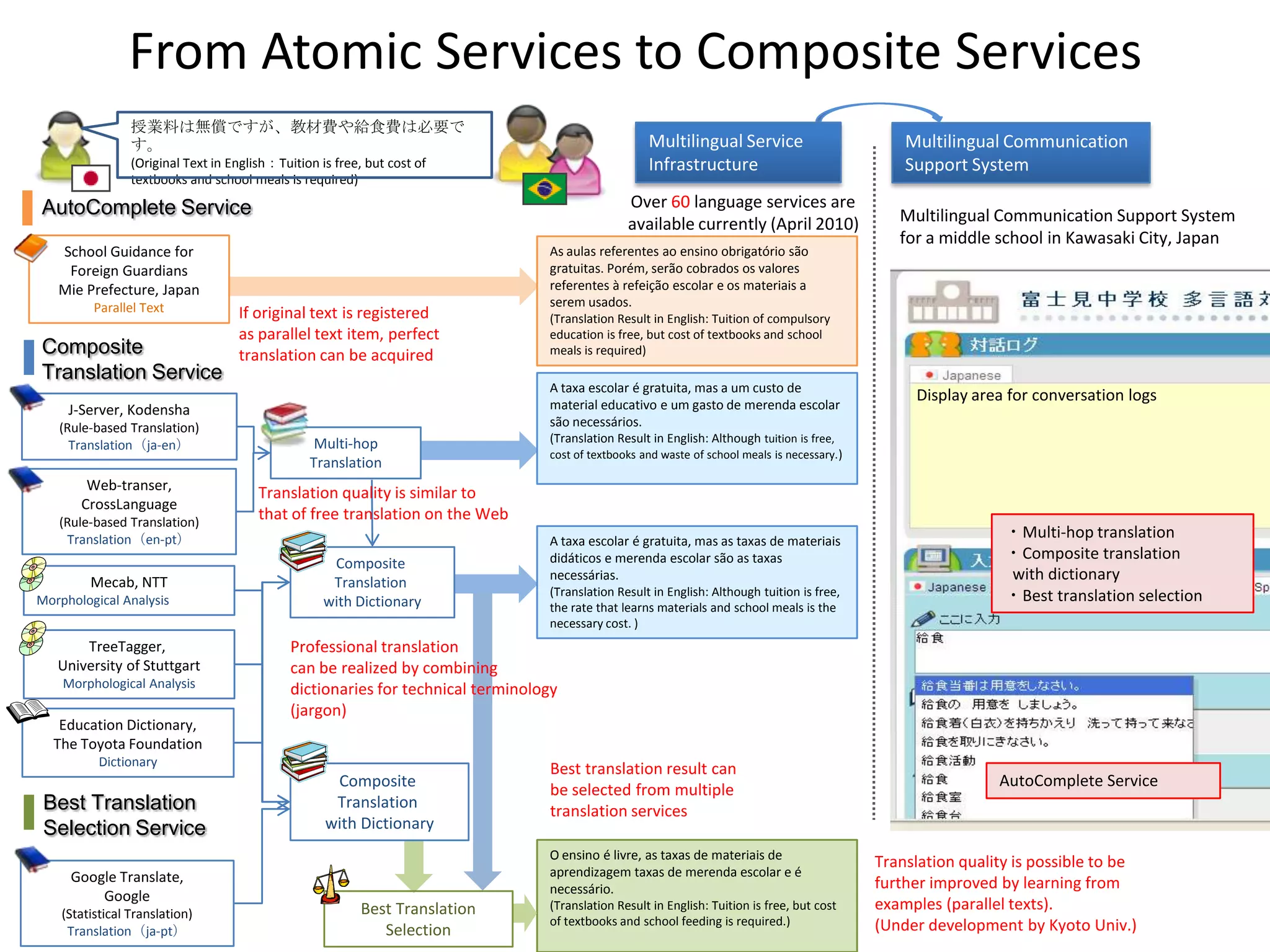 5. 5. From Atomic Services to Composite Services<br />授業料は無償ですが、教材費や給食費は必要です。<br />(Original Text in English:Tuition is free,but cost of textbooks and school meals is required)<br />Multilingual Service Infrastructure<br />Multilingual Communication Support System<br />Over60 language services are <br />available currently (April 2010)<br />AutoComplete Service<br />Multilingual Communication Support System for a middle school in Kawasaki City, Japan<br />School Guidance for Foreign Guardians<br />Mie Prefecture, JapanParallel Text<br />As aulas referentes ao ensino obrigatório são gratuitas. Porém, serão cobrados os valores referentes à refeição escolar e os materiais a serem usados.<br />(Translation Result in English: Tuition of compulsory education is free,but cost of textbooks and school meals is required)<br />If original text is registered <br />as parallel text item, perfect <br />translation can be acquired<br />Composite Translation Service<br />A taxa escolar é gratuita, mas a um custo de material educativo e um gasto de merenda escolar são necessários.<br />(Translation Result in English: Although tuition is free,cost of textbooks and waste of school meals is necessary.)<br />Display area for conversationlogs <br />J-Server, Kodensha<br />(Rule-based Translation)<br />Translation(ja-en)<br />Multi-hop Translation<br />Web-transer,<br />CrossLanguage<br />(Rule-based Translation)<br />Translation(en-pt)<br />Translation quality is similar to <br />that of free translation on the Web<br />・Multi-hop translation<br />・Composite translation <br /> with dictionary <br />・Best translation selection<br />A taxa escolar é gratuita, mas as taxas de materiais didáticos e merenda escolar são as taxas necessárias.<br />(Translation Result in English: Although tuition is free,the rate that learns materials and school meals is the necessary cost. )<br />Composite <br />Translation with Dictionary<br />Mecab, NTT<br />Morphological Analysis<br />Professional translation <br />can be realized by combining<br />dictionaries fortechnical terminology (jargon)<br />TreeTagger,<br />University of Stuttgart<br />Morphological Analysis<br />Education Dictionary, <br />The Toyota Foundation<br />Dictionary<br />Best translation result can <br />be selected from multiple <br />translation services<br />AutoComplete Service<br />Composite <br />Translation with Dictionary<br />Best Translation Selection Service<br />O ensino é livre, as taxas de materiais de aprendizagem taxas de merenda escolar e é necessário.<br />(Translation Result in English: Tuition is free,but cost of textbooks and school feeding is required.)<br />Translation quality is possible to be<br />further improved by learning from <br />examples (parallel texts).<br />(Under development by Kyoto Univ.)<br />GoogleTranslate, <br />Google<br />(Statistical Translation)<br />Translation(ja-pt)<br />Best Translation<br />Selection<br />