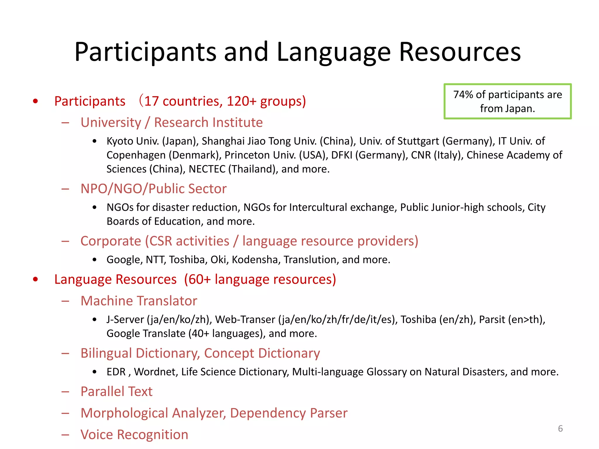 6. 6. Participants and Language Resources<br />74% of participants are from Japan.<br /><ul><li>Participants (17 countries, 120+ groups)