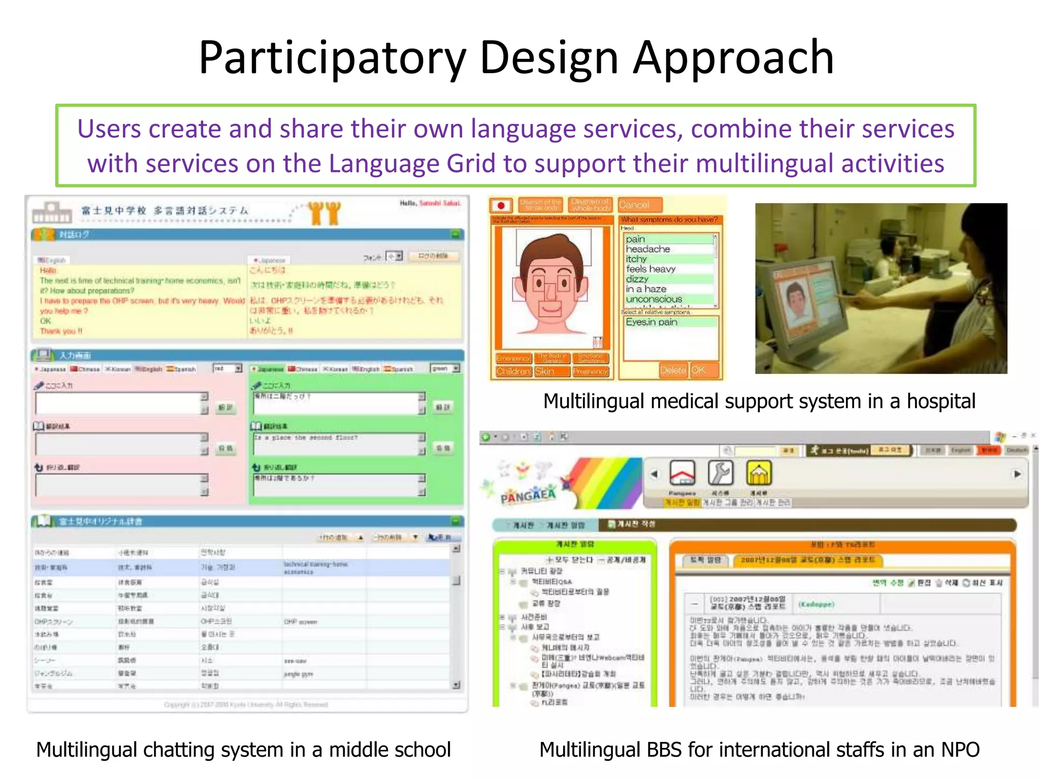21. 21. Participatory Design Approach<br />Users create and share their own language services, combine their services with services on the Language Grid to support their multilingual activities<br />Multilingual medical support system in a hospital<br />Multilingual chatting system in a middle school<br />Multilingual BBS for international staffs in an NPO <br />