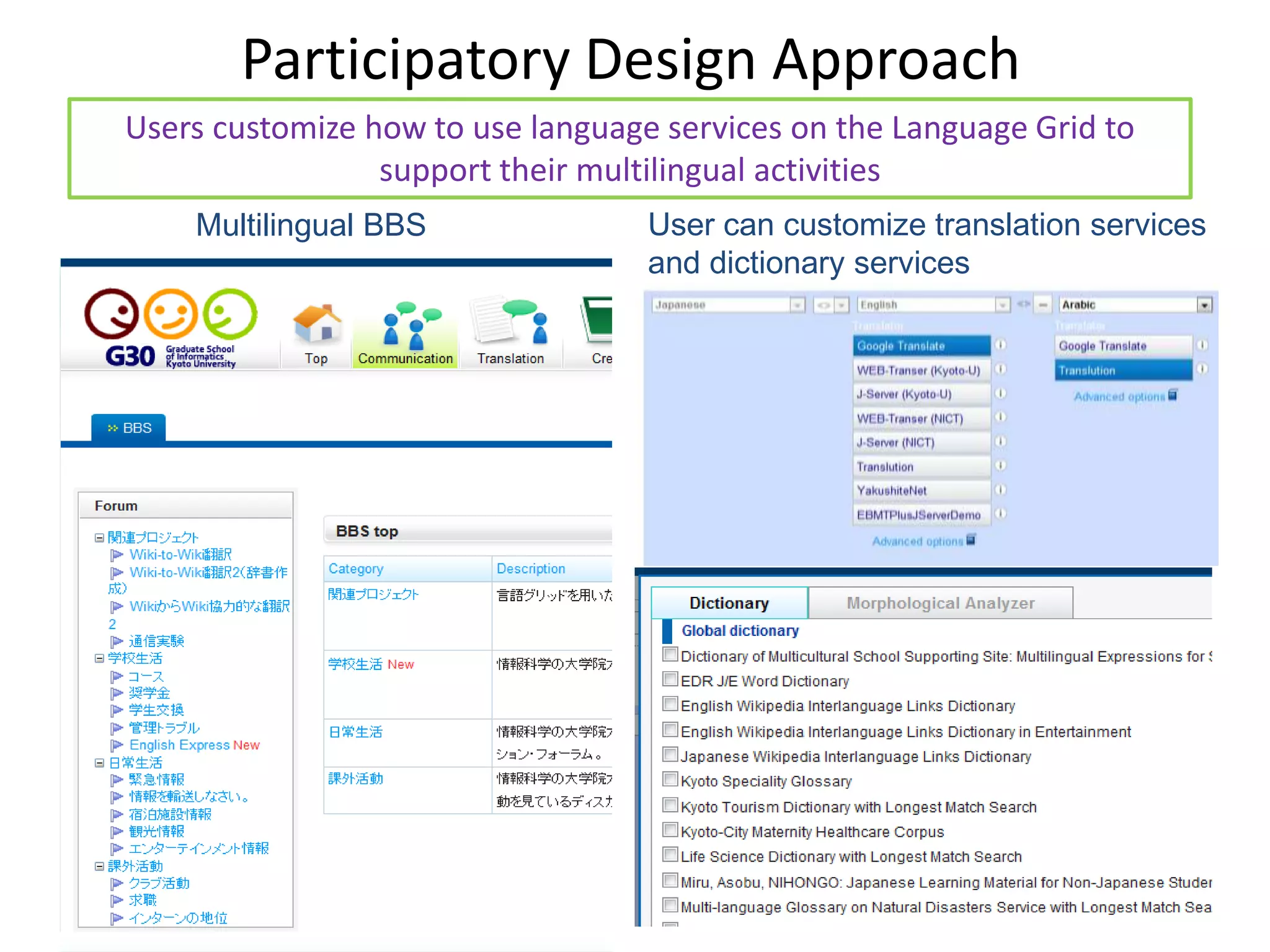22. 22. Participatory Design Approach<br />Users customize how to use language services on the Language Grid to support their multilingual activities<br />User can customize translation services <br />and dictionary services<br />Multilingual BBS<br />