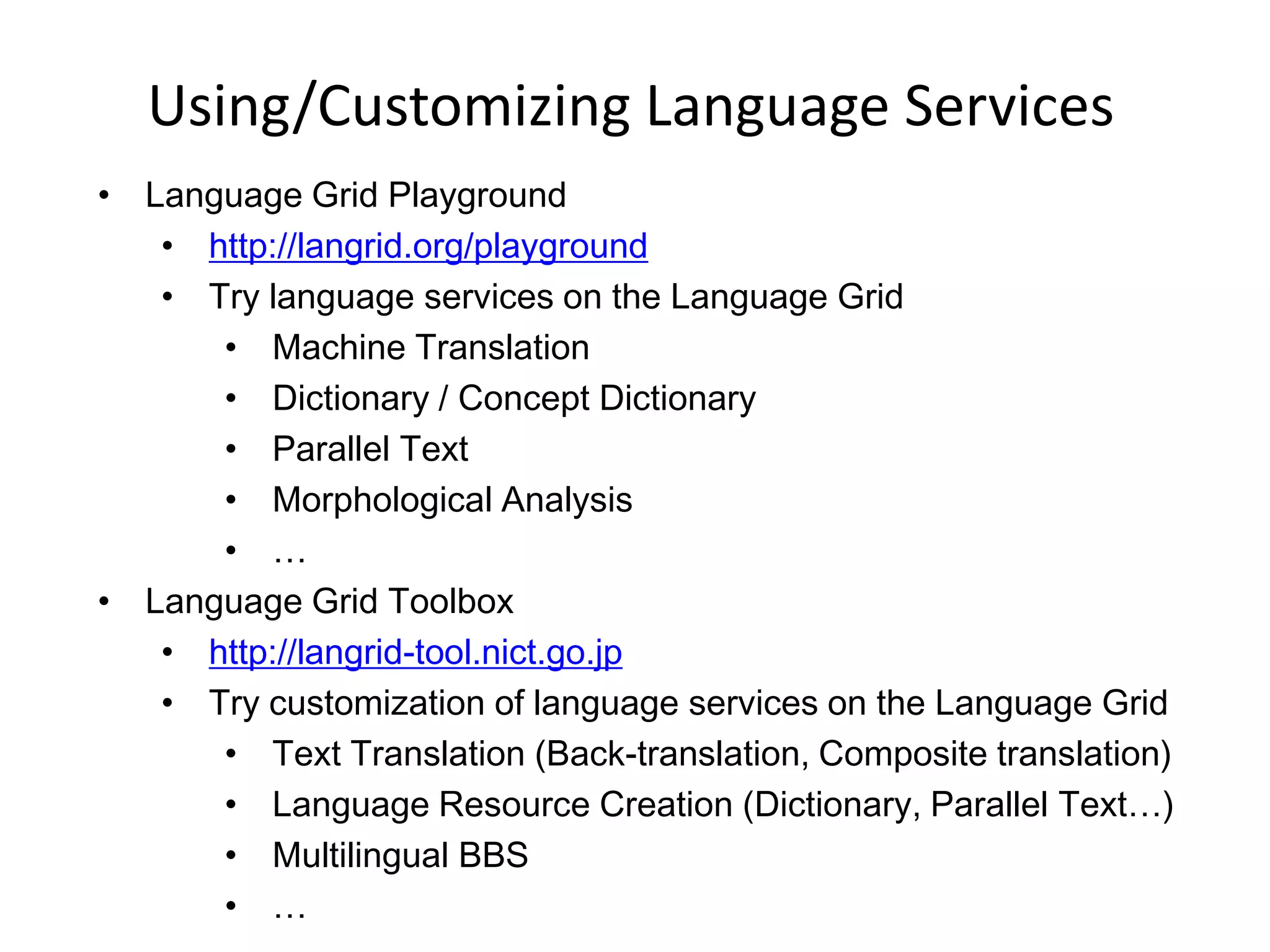 23. 23. Using/Customizing Language Services<br /><ul><li>Language Grid Playground