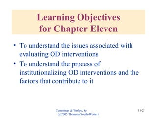 2. 2. Cummings & Worley, 8e (c)2005 Thomson/South-Western 11-2 Learning Objectives for Chapter Eleven • To understand the issues associated with evaluating OD interventions • To understand the process of institutionalizing OD interventions and the factors that contribute to it