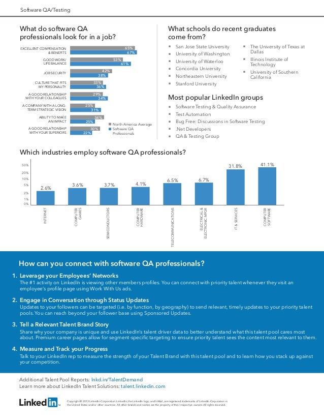 Better understand the supply and demand for professionals with skills in software and QA testing across North America. These Talent Pool Reports are based on data from LinkedIn's network of 238 million professionals and the results from a survey of over 100,000 LinkedIn members.