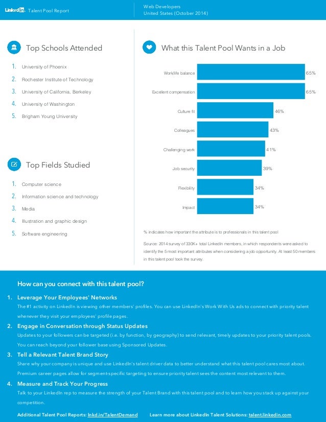 See the supply and demand for web developers across the US. Talent Pool Insights are gathered from LinkedIn's 313M+ members worldwide. We define talent pool audiences based on the skills and occupations listed on member profiles.