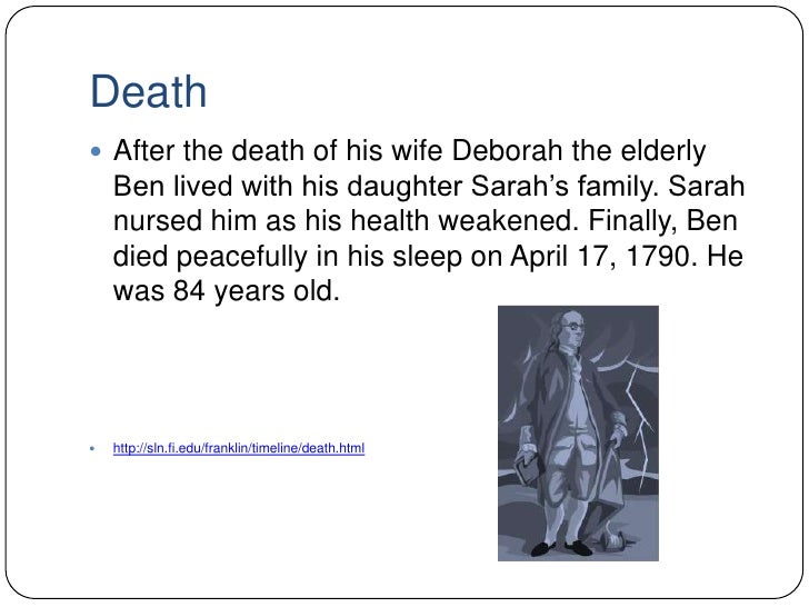 10. 10. Death<br />After the death of his wife Deborah the elderly Ben lived with his daughter Sarah’s family. Sarah nursed him as his health weakened. Finally, Ben died peacefully in his sleep on April 17, 1790. He was 84 years old. <br />http://sln.fi.edu/franklin/timeline/death.html<br />