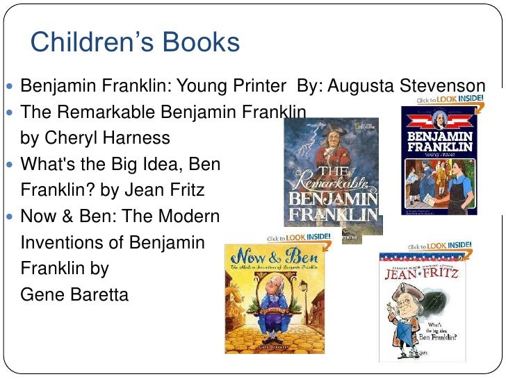 11. 11. Children’s Books <br />Benjamin Franklin: Young Printer By: Augusta Stevenson<br />The Remarkable Benjamin Franklin <br /> by Cheryl Harness<br />What&apos;s the Big Idea, Ben <br /> Franklin? by Jean Fritz<br />Now & Ben: The Modern <br /> Inventions of Benjamin <br /> Franklin by <br /> Gene Baretta<br />