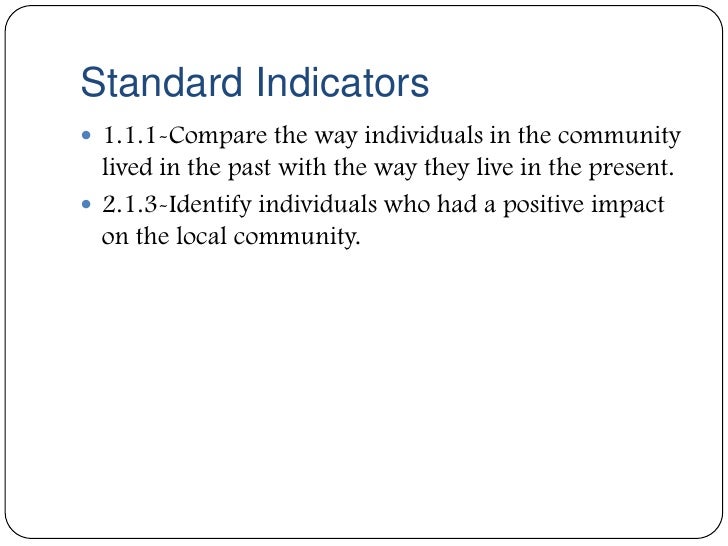 12. 12. Standard Indicators<br />1.1.1-Compare the way individuals in the community lived in the past with the way they live in the present.<br />2.1.3-Identify individuals who had a positive impact on the local community.<br />