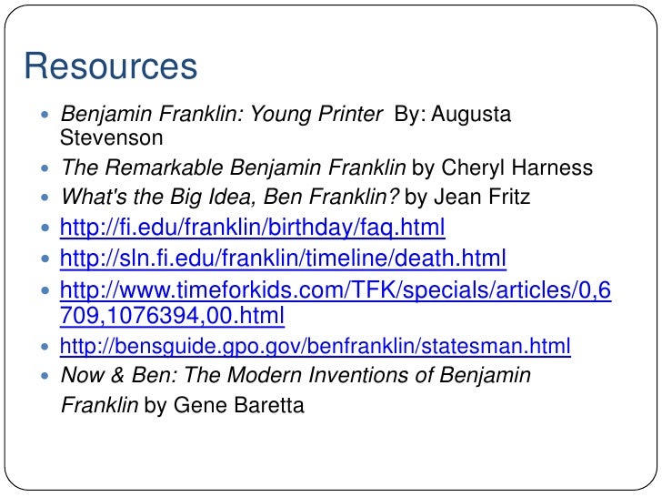 13. 13. Resources<br />Benjamin Franklin: Young Printer By: Augusta Stevenson<br />The Remarkable Benjamin Franklin by Cheryl Harness<br />What&apos;s the Big Idea, Ben Franklin? by Jean Fritz<br />http://fi.edu/franklin/birthday/faq.html<br />http://sln.fi.edu/franklin/timeline/death.html<br />http://www.timeforkids.com/TFK/specials/articles/0,6709,1076394,00.html<br />http://bensguide.gpo.gov/benfranklin/statesman.html<br />Now & Ben: The Modern Inventions of Benjamin <br /> Franklin by Gene Baretta<br />