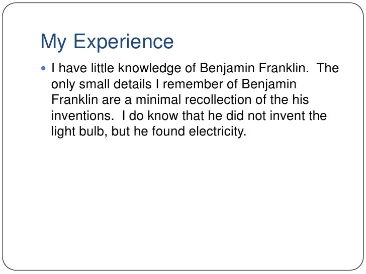 2. 2. My Experience<br />I have little knowledge of Benjamin Franklin. The only small details I remember of Benjamin Franklin are a minimal recollection of the his inventions. I do know that he did not invent the light bulb, but he found electricity.<br />