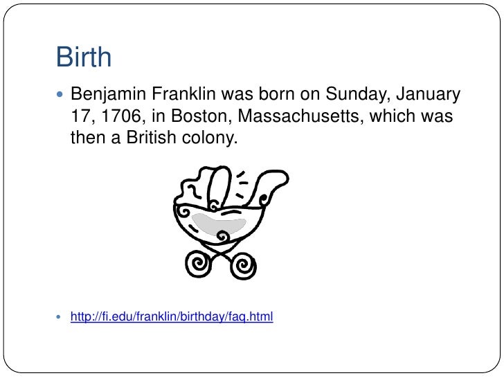 5. 5. Birth<br />Benjamin Franklin was born on Sunday, January 17, 1706, in Boston, Massachusetts, which was then a British colony. <br />http://fi.edu/franklin/birthday/faq.html<br />