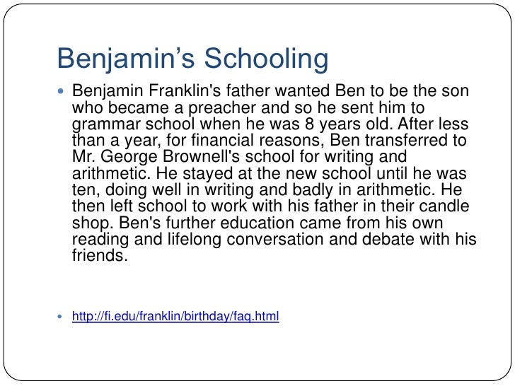 7. 7. Benjamin’s Schooling<br />Benjamin Franklin&apos;s father wanted Ben to be the son who became a preacher and so he sent him to grammar school when he was 8 years old. After less than a year, for financial reasons, Ben transferred to Mr. George Brownell&apos;s school for writing and arithmetic. He stayed at the new school until he was ten, doing well in writing and badly in arithmetic. He then left school to work with his father in their candle shop. Ben&apos;s further education came from his own reading and lifelong conversation and debate with his friends.<br />http://fi.edu/franklin/birthday/faq.html<br />