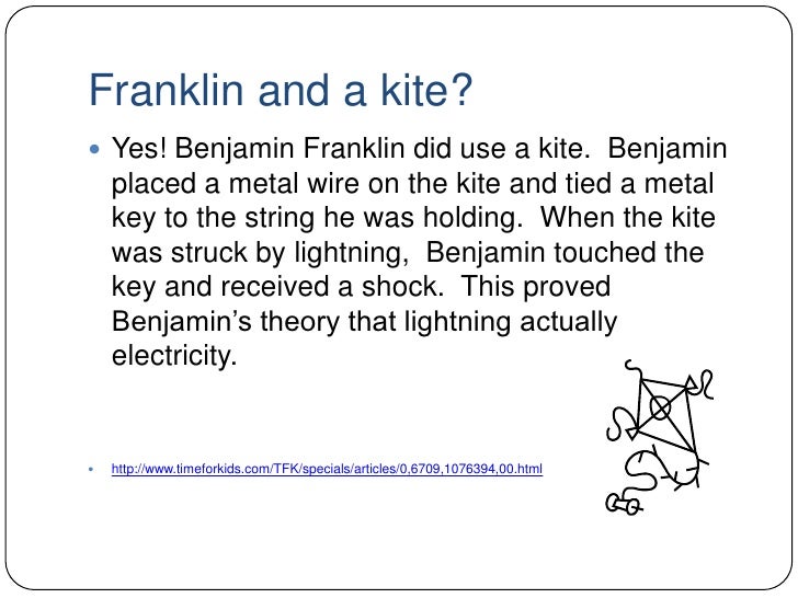 8. 8. Franklin and a kite?<br />Yes! Benjamin Franklin did use a kite. Benjamin placed a metal wire on the kite and tied a metal key to the string he was holding. When the kite was struck by lightning, Benjamin touched the key and received a shock. This proved Benjamin’s theory that lightning actually electricity. <br />http://www.timeforkids.com/TFK/specials/articles/0,6709,1076394,00.html<br />