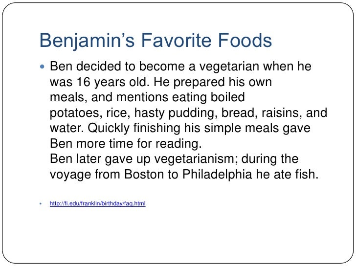 9. 9. Benjamin’s Favorite Foods<br />Ben decided to become a vegetarian when he was 16 years old. He prepared his own meals, and mentions eating boiled potatoes, rice, hasty pudding, bread, raisins, and water. Quickly finishing his simple meals gave Ben more time for reading.Ben later gave up vegetarianism; during the voyage from Boston to Philadelphia he ate fish.<br />http://fi.edu/franklin/birthday/faq.html<br />