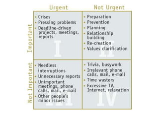 This document discusses time management using a time matrix that categorizes tasks as either urgent or not urgent, and important or not important. It provides examples of common tasks like school work, social media, projects, and emails and identifies which quadrant each would belong to based on their urgency and importance. The matrix is meant to help prioritize tasks by focusing first on things that are urgent and important.