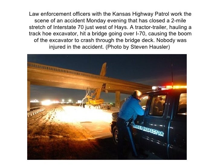 2. 2. Law enforcement officers with the Kansas Highway Patrol work the scene of an accident Monday evening that has closed a 2-mile stretch of Interstate 70 just west of Hays. A tractor-trailer, hauling a track hoe excavator, hit a bridge going over I-70, causing the boom of the excavator to crash through the bridge deck. Nobody was injured in the accident. (Photo by Steven Hausler)
