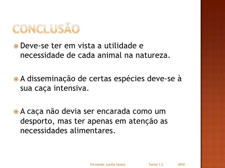 10. 10. conclusão<br />Deve-se ter em vista a utilidade e necessidade de cada animal na natureza.<br />A disseminação de certas espécies deve-se à sua caça intensiva.<br />A caça não devia ser encarada como um desporto, mas ter apenas em atenção as necessidades alimentares.<br />Formanda: Lucilia Santos Turma 1.2 2010<br />