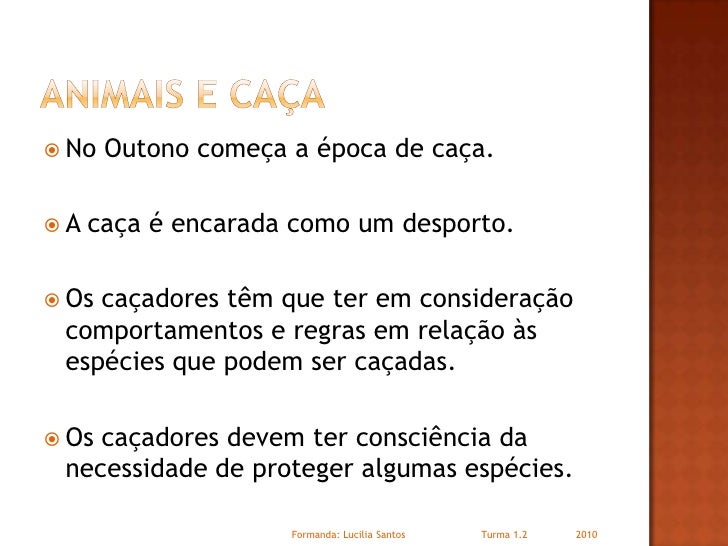 2. 2. Animais e Caça<br />No Outono começa a época de caça.<br />A caça é encarada como um desporto.<br />Os caçadores têm que ter em consideração comportamentos e regras em relação às espécies que podem ser caçadas.<br />Os caçadores devem ter consciência da necessidade de proteger algumas espécies.<br />Formanda: Lucilia Santos Turma 1.2 2010<br />