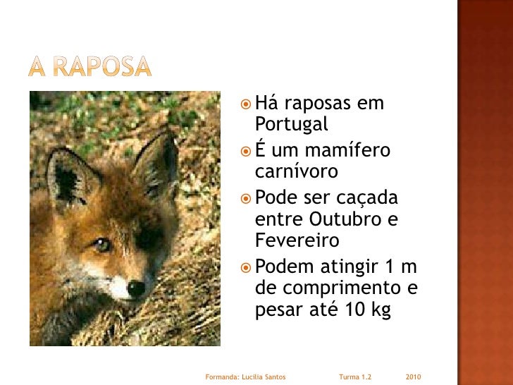 A Raposa<br />Há raposas em Portugal<br />É um mamífero carnívoro<br />Pode ser caçada entre Outubro e Fevereiro<br />Pode...