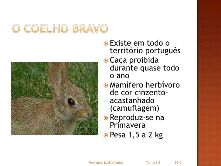 4. 4. O coelho bravo<br />Existe em todo o território português<br />Caça proibida durante quase todo o ano<br />Mamífero herbívoro de cor cinzento-acastanhado (camuflagem)<br />Reproduz-se na Primavera<br />Pesa 1,5 a 2 kg<br />Formanda: Lucilia Santos Turma 1.2 2010<br />