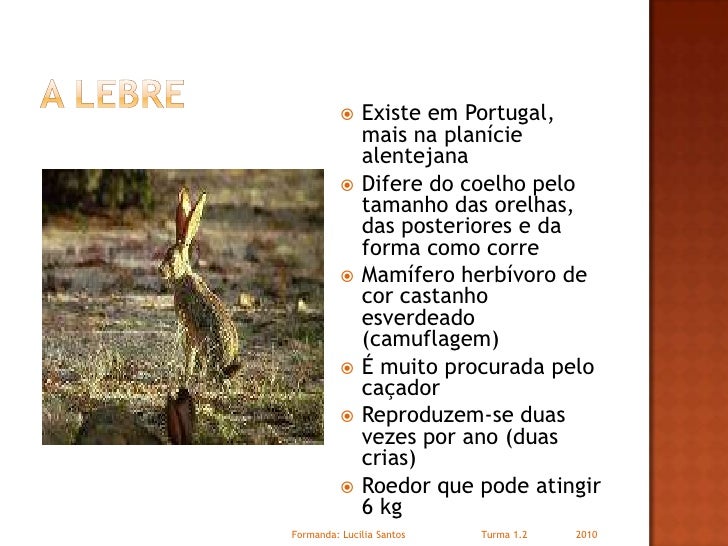 5. 5. A lebre<br />Existe em Portugal, mais na planície alentejana<br />Difere do coelho pelo tamanho das orelhas, das posteriores e da forma como corre<br />Mamífero herbívoro de cor castanho esverdeado (camuflagem)<br />É muito procurada pelo caçador<br />Reproduzem-se duas vezes por ano (duas crias)<br />Roedor que pode atingir 6 kg<br />Formanda: Lucilia Santos Turma 1.2 2010<br />