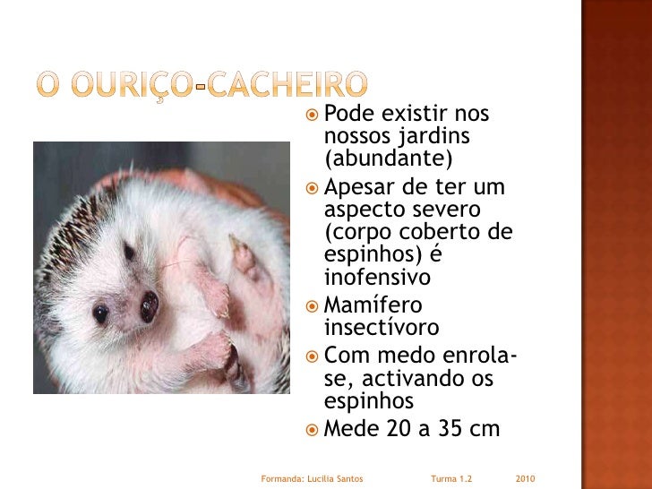 6. 6. O ouriço-cacheiro<br />Pode existir nos nossos jardins (abundante)<br />Apesar de ter um aspecto severo (corpo coberto de espinhos) é inofensivo<br />Mamífero insectívoro<br />Com medo enrola-se, activando os espinhos<br />Mede 20 a 35 cm<br />Formanda: Lucilia Santos Turma 1.2 2010<br />