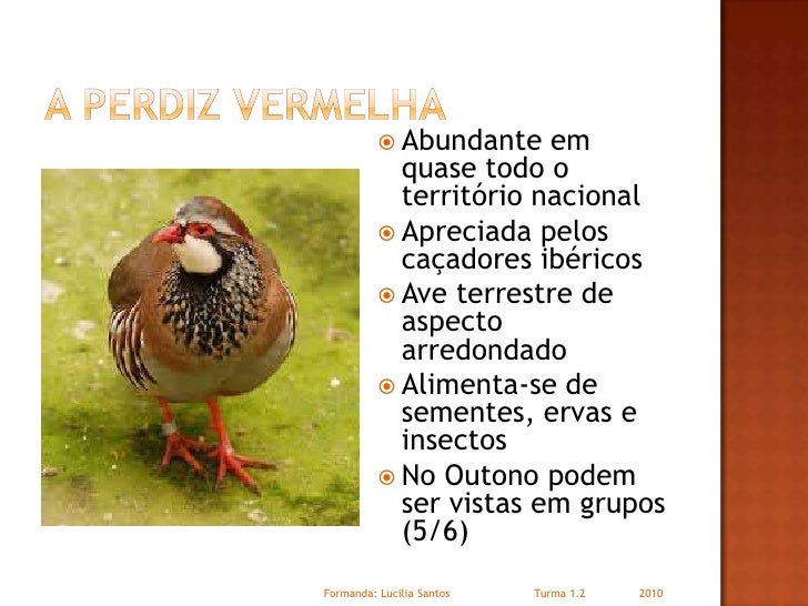 7. 7. A perdiz vermelha<br />Abundante em quase todo o território nacional<br />Apreciada pelos caçadores ibéricos<br />Ave terrestre de aspecto arredondado<br />Alimenta-se de sementes, ervas e insectos<br />No Outono podem ser vistas em grupos (5/6)<br />Formanda: Lucilia Santos Turma 1.2 2010<br />