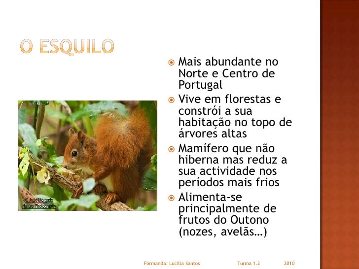 8. 8. O esquilo<br />Mais abundante no Norte e Centro de Portugal<br />Vive em florestas e constrói a sua habitação no topo de árvores altas<br />Mamífero que não hiberna mas reduz a sua actividade nos períodos mais frios<br />Alimenta-se principalmente de frutos do Outono (nozes, avelãs…)<br />Formanda: Lucilia Santos Turma 1.2 2010<br />