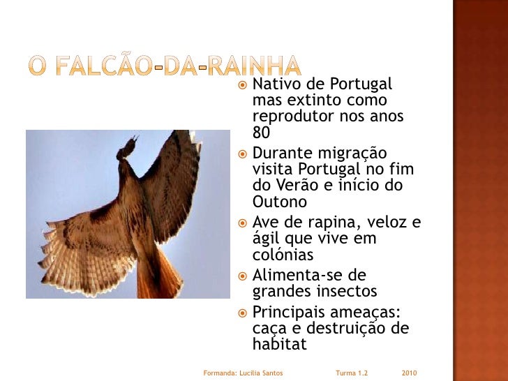 9. 9. O falcão-da-rainha<br />Nativo de Portugal mas extinto como reprodutor nos anos 80<br />Durante migração visita Portugal no fim do Verão e início do Outono<br />Ave de rapina, veloz e ágil que vive em colónias<br />Alimenta-se de grandes insectos<br />Principais ameaças: caça e destruição de habitat<br />Formanda: Lucilia Santos Turma 1.2 2010<br />