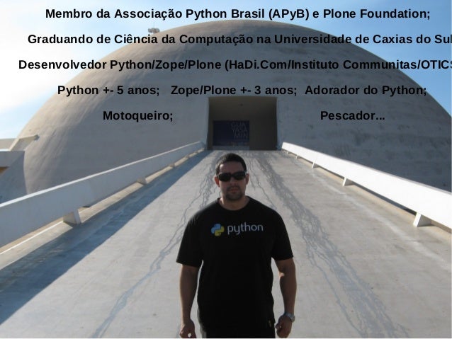 2. 2. Membro da Associação Python Brasil (APyB) e Plone Foundation; Graduando de Ciência da Computação na Universidade de Caxias do Sul Desenvolvedor Python/Zope/Plone (HaDi.Com/Instituto Communitas/OTICS Python +- 5 anos; Zope/Plone +- 3 anos; Adorador do Python; Motoqueiro; Pescador...