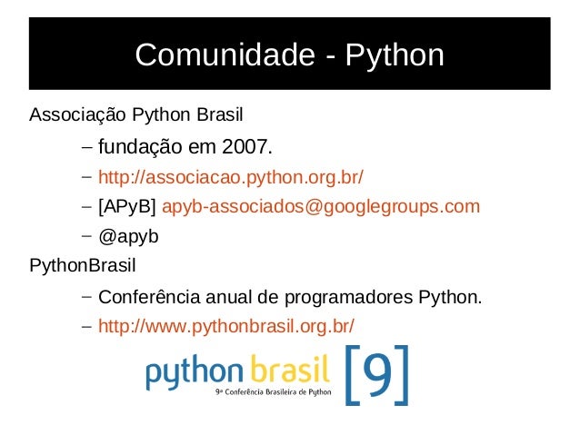4. 4. Comunidade - Python Associação Python Brasil – fundação em 2007. – http://associacao.python.org.br/ – [APyB] apyb-associados@googlegroups.com – @apyb PythonBrasil – Conferência anual de programadores Python. – http://www.pythonbrasil.org.br/