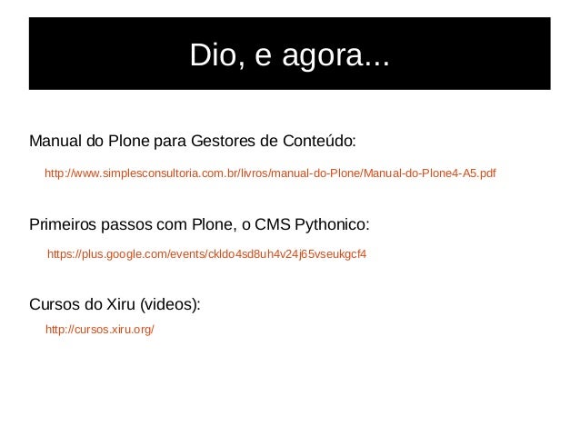 41. 41. Dio, e agora... Manual do Plone para Gestores de Conteúdo: http://www.simplesconsultoria.com.br/livros/manual-do-Plone/Manual-do-Plone4-A5.pdf Primeiros passos com Plone, o CMS Pythonico: https://plus.google.com/events/ckldo4sd8uh4v24j65vseukgcf4 Cursos do Xiru (videos): http://cursos.xiru.org/