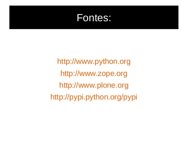 42. 42. Fontes: http://www.python.org http://www.zope.org http://www.plone.org http://pypi.python.org/pypi