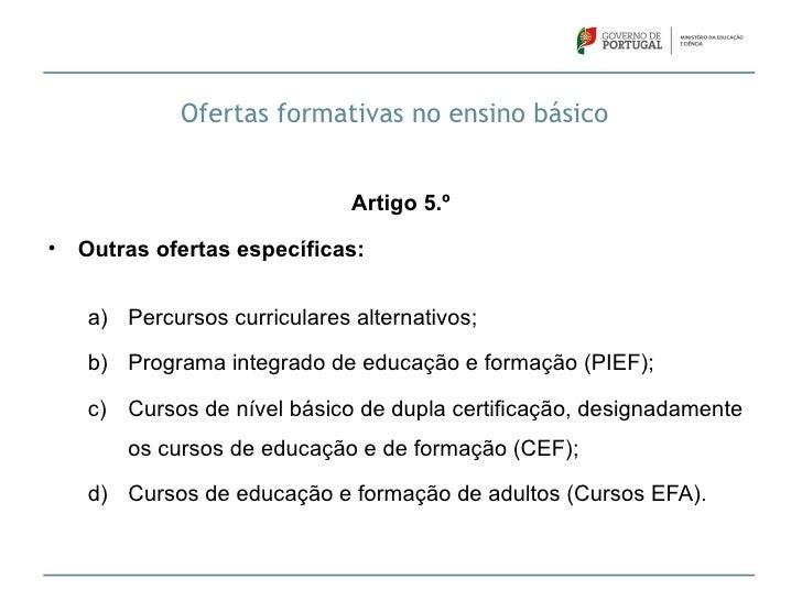 10. 10. Ofertas formativas no ensino básico Artigo 5.º• Outras ofertas específicas: a) Percursos curriculares alternativos; b) Programa integrado de educação e formação (PIEF); c) Cursos de nível básico de dupla certificação, designadamente os cursos de educação e de formação (CEF); d) Cursos de educação e formação de adultos (Cursos EFA).