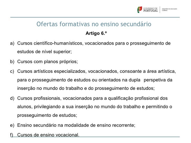 11. 11. Ofertas formativas no ensino secundário Artigo 6.ºa) Cursos científico-humanísticos, vocacionados para o prosseguimento de estudos de nível superior;b) Cursos com planos próprios;c) Cursos artísticos especializados, vocacionados, consoante a área artística, para o prosseguimento de estudos ou orientados na dupla perspetiva da inserção no mundo do trabalho e do prosseguimento de estudos;d) Cursos profissionais, vocacionados para a qualificação profissional dos alunos, privilegiando a sua inserção no mundo do trabalho e permitindo o prosseguimento de estudos;e) Ensino secundário na modalidade de ensino recorrente;f) Cursos de ensino vocacional.