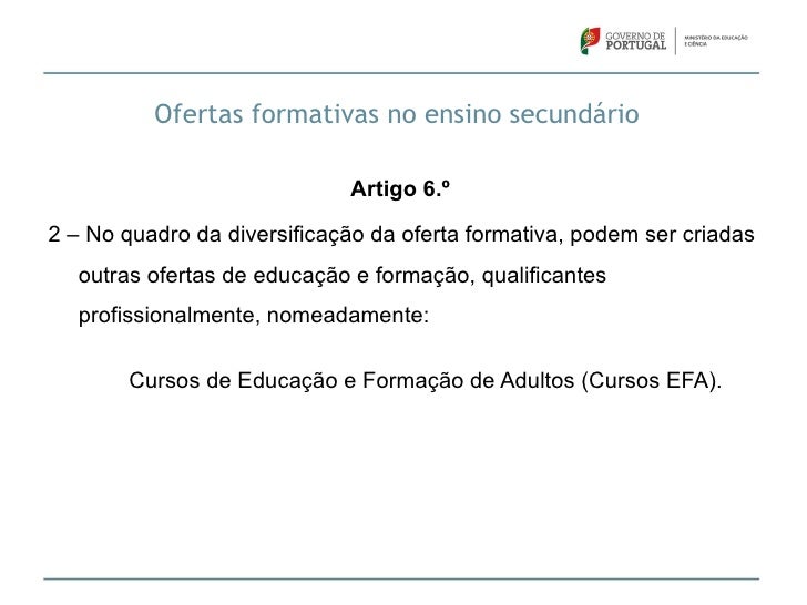 12. 12. Ofertas formativas no ensino secundário Artigo 6.º2 – No quadro da diversificação da oferta formativa, podem ser criadas outras ofertas de educação e formação, qualificantes profissionalmente, nomeadamente: Cursos de Educação e Formação de Adultos (Cursos EFA).