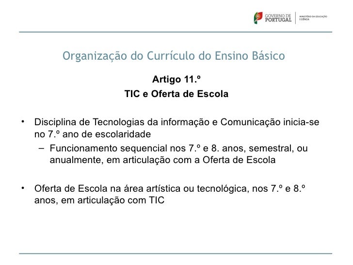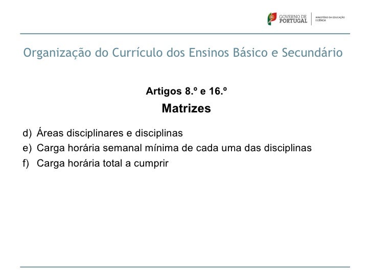 13. 13. Organização do Currículo dos Ensinos Básico e Secundário Artigos 8.º e 16.º Matrizesd) Áreas disciplinares e disciplinase) Carga horária semanal mínima de cada uma das disciplinasf) Carga horária total a cumprir